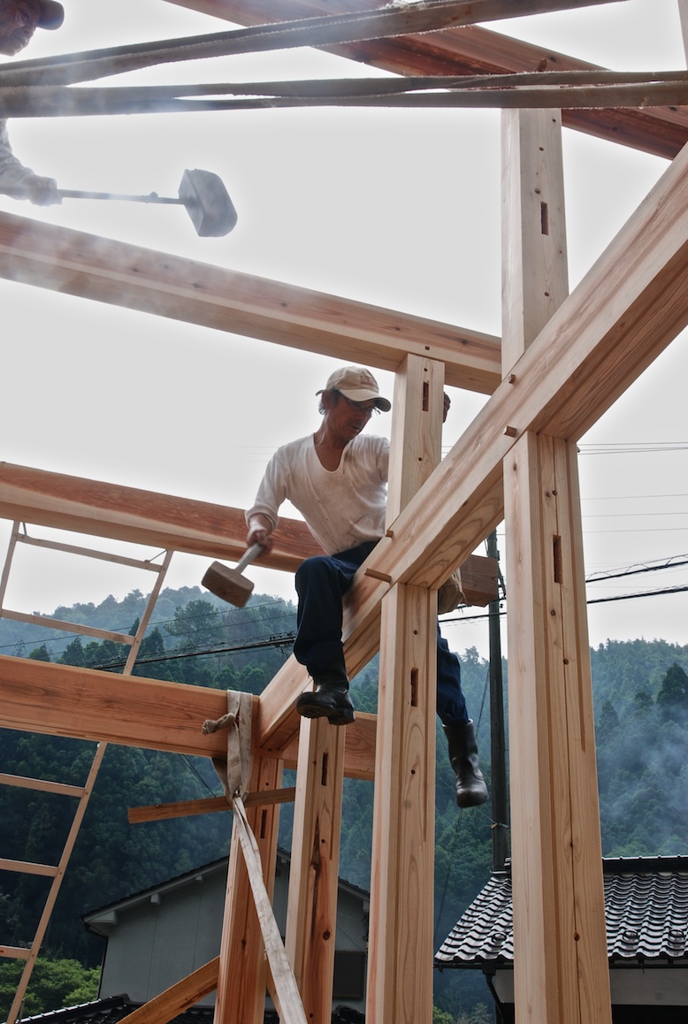 Les voici. Les charpentiers travaillent en hauteur. Avec les gros maillets ils vont forcer les pièces dans les autres.