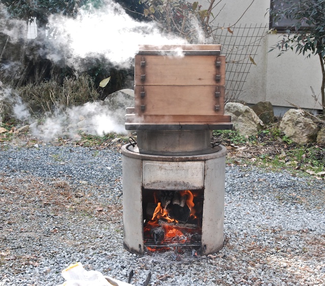 Le 30 décembre des voisins nous ont invités à préparer le mochi, une galette de riz gluant, cuit à la vapeur.