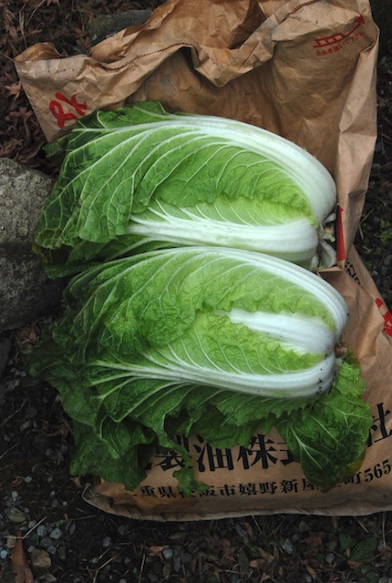 Nous venons de finir la première fournée de mochi. Quelqu’un passe, un voisin, il est venu apporter des légumes de son jardin. Il nous offre des daikons et des chous chinois. Ses légumes sont magnifiques. Ils sont d’ailleurs passés dans le journal et le monsieur nous montre une copie des articles.