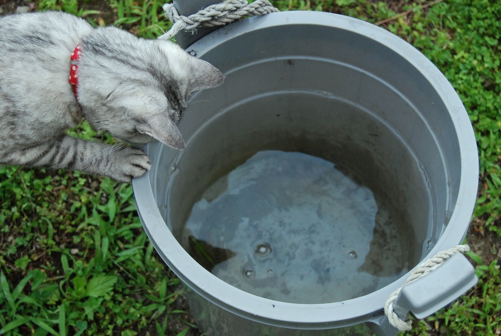 Mais chose bien plus extraordinaire, Minou le chat qui vaquait là, a tout de suite senti la présence de la grenouille dans le seau et s’approche …