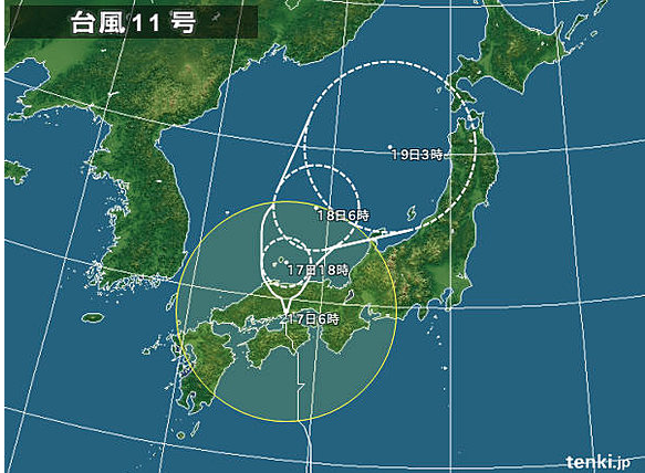 Ah donc ce serait le onzième typhon cette année ? Celui-ci passe dans la région, traverse le Japon dans un axe sud nord, à hauteur de Shikoku.