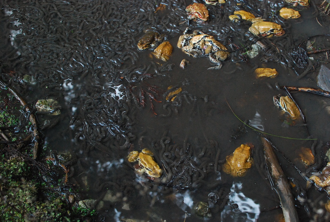 Un peu plus loin sur le bord du chemin; peu après les ruines d’un temple qui a disparu dans un incendie il y a quelques années, des tâches brunes s’étalent dans une flaque d’eau. Je m’arrête et descends du camion pour voir de quoi il s’agit. Oups, des dizaines de crapauds partouzent tranquillement comme si de rien n’était. La puissance de la nature. Il doit déjà y avoir des dizaines de milliers d’oeufs dans cette flaque d’eau. Qui sait combien de ces oeufs formeront des têtards, et combien feront le régal des tritons et des salamandres, et combien deviendront de beaux crapauds bien gluants en mesure de perpétuer l’espèce.