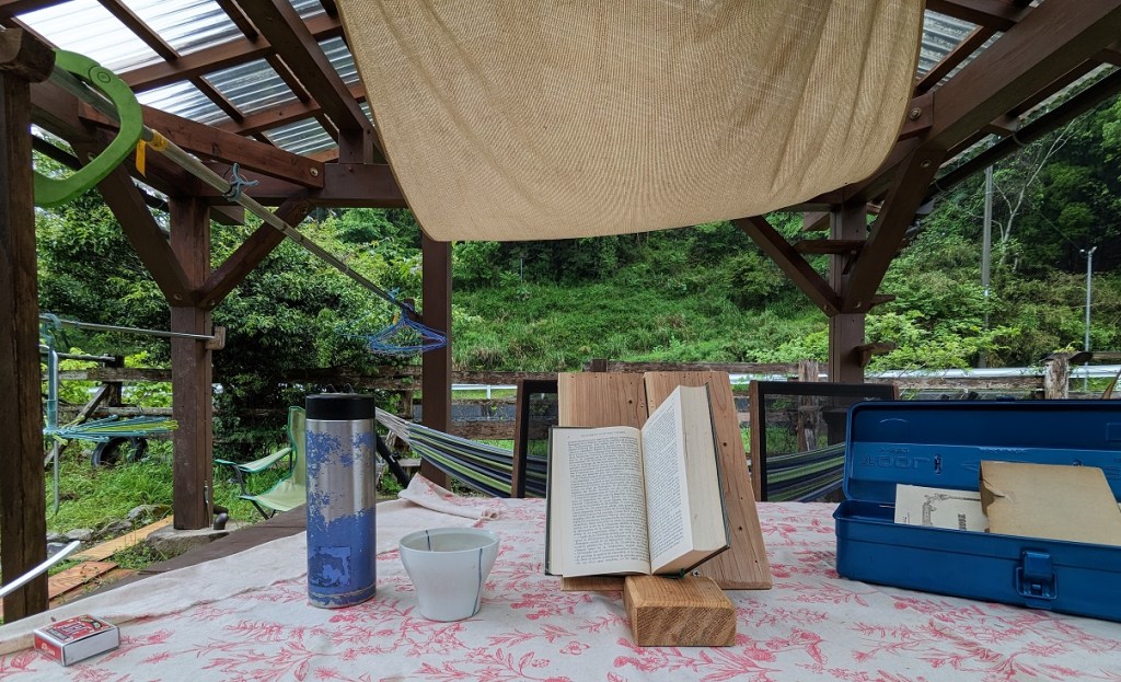 Dans la deuxième pièce du garage une table triangulaire permettait de s’asseoir; goûter au thé bancha fait maison et d’échanger tranquillement.