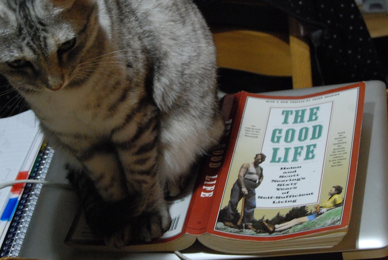 - p.31 We would attempt to carry on this self-subsistent economy by the following steps: (1) raising as much of our own food as local soil and climatic conditions would permit. (2) Bartening our products for those which we could not or did not produce. (3) Using wood for fuel and cutting it ourselves. (4) Putting up our own buildings with stone and wood from the place, doing the work ourselves. (5) Making such implements as sleds, drays, stone=boats, gravel screens, ladders. (6) Holding down to the barest minimum the number of implements, tools, gadgets and machines which we might buy from the assembly lines of big business (7) If we had to have such machines for a few hours or days in a year *plough, tractor, rototiller, bulldozer, chainsaw), we would rent or trade them for local people instead of buying and owning them.