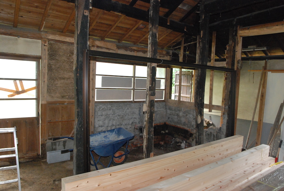 A noter aussi le mur en torchis d’origine sous la poutre. La partie neuve en latis sera ensuite recouverte de shikkui (enduit traditionnel)