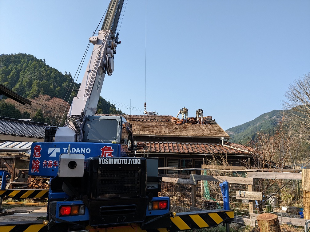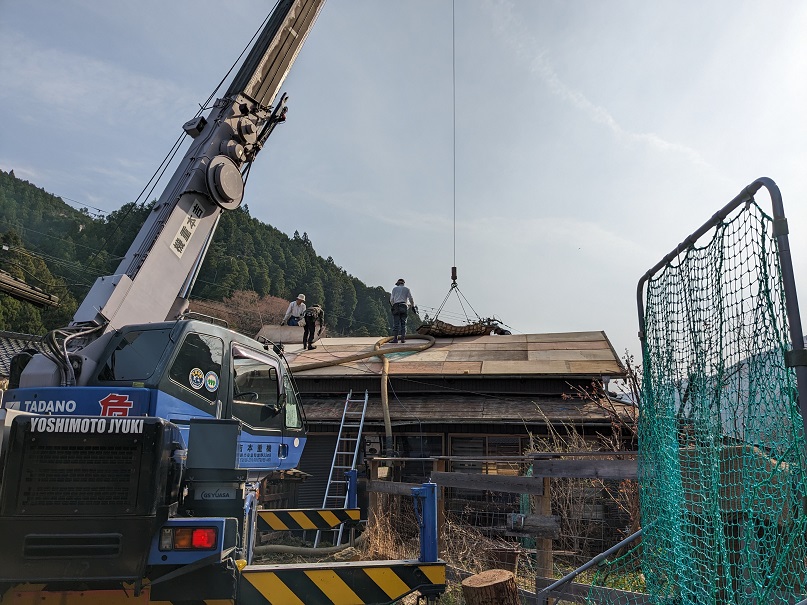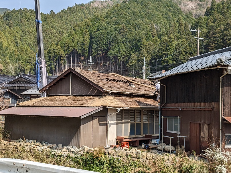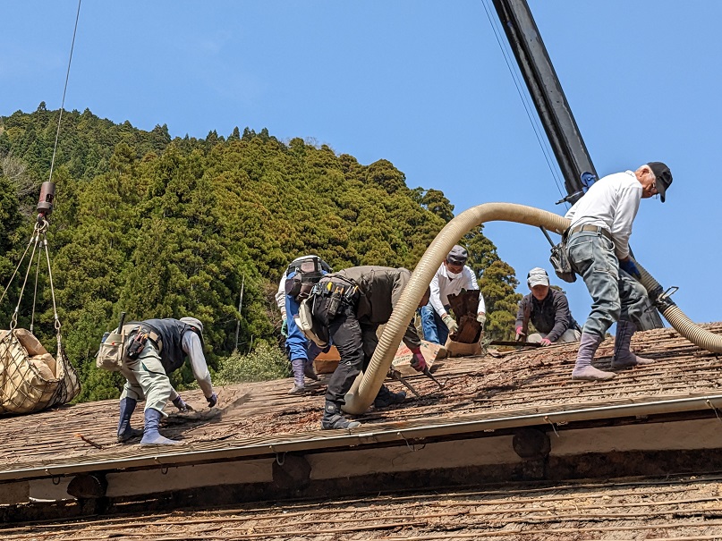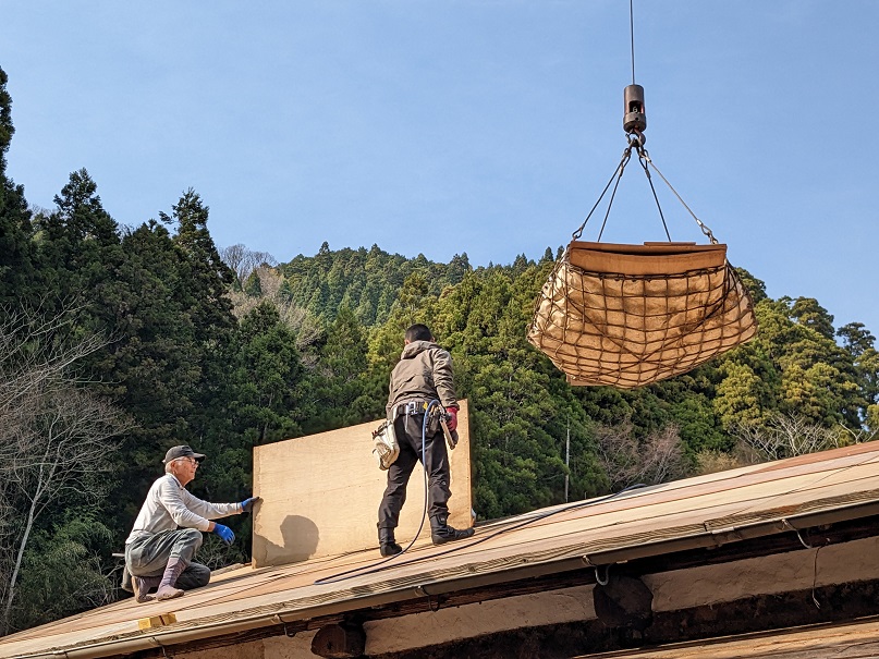 On peut discerner les feuilles d’écorce de cryptomère qui étaient juste sous les tuiles.