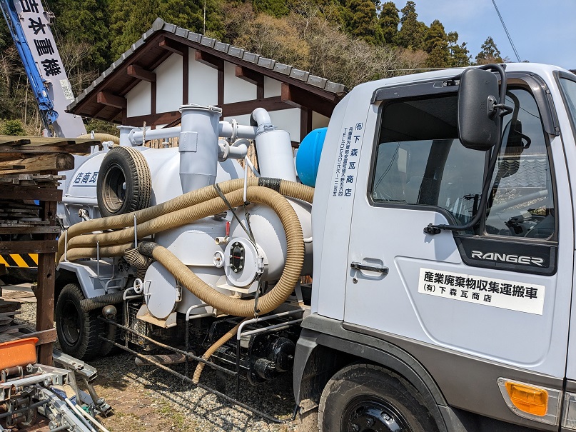 Ils amènent ce camion aspirateur pour retirer la terre et les petits débris du toit