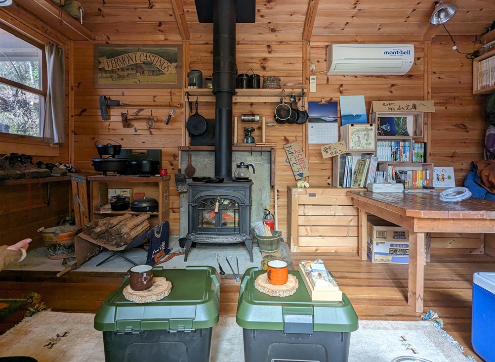 Je les suivais sur instagram avec intérêt depuis longtemps, et sur une de leurs photos insta ils montraient une petite bibliothèque qu’ils avaient conçue pour y mettre en valeur des livres sur la montagne et la nature. J’ai du ajouter un commentaire signifiant mon admiration pour ce projet, et leur réponse disait: ‘on voudrait bien ajouter ta bande dessinée 失われた田舎暮らしを求めて dans cette bibliothèque (la version japonaise de Retour Sur Terre– dont le titre japonais traduit littéralement signifie ‘à la recherche de la vie à la campagne perdue‘.)