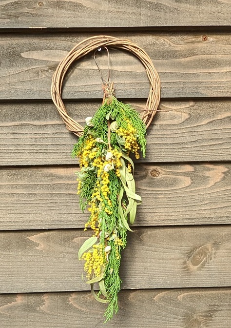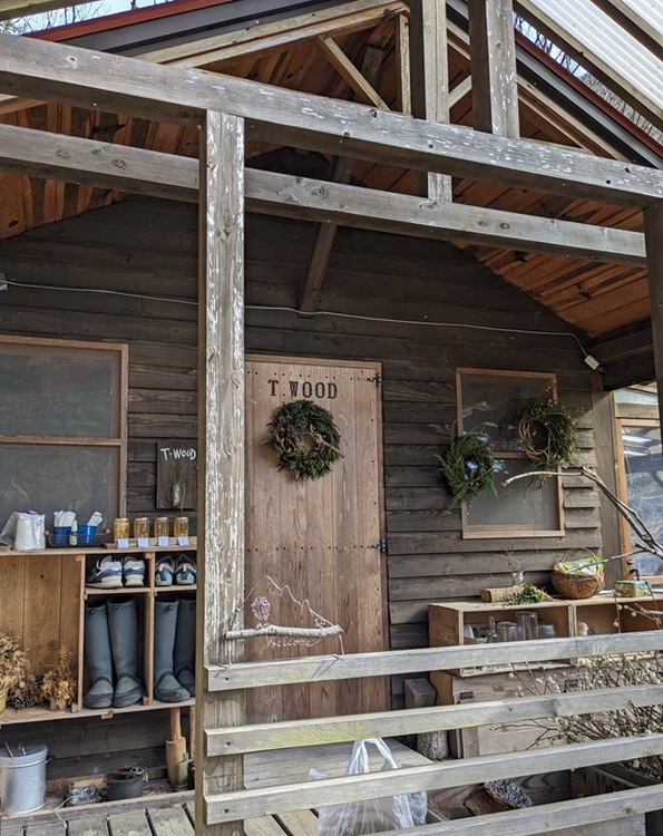 Adjacent à leur maison ils ont installé une plateforme surélevée où avec une vue plongeante sur la forêt ils donnent des cours le week end de composition florale. Leurs élèves de la journée arriveront bientôt et ils feront des choses avec du mimosa.