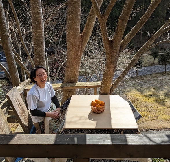 Ils ont ajouté aussi une petite extension à la plateforme qui rejoint un bel arbre. Là on peut s’assoir « en altitude » et se mettre dans un kotatsu (table basse chauffante) et admirer le paysage comme si l’on était un momonga. (l’écureuil volant japonais).