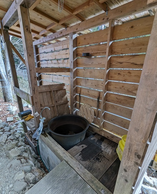 Nous aurions pu observer le four à pain et à pizza. Nous aurions pu observer aussi leur baignoire traditionnelle (et extérieure), le fameux goémon buro, avec vue sur la foret et les momongas.