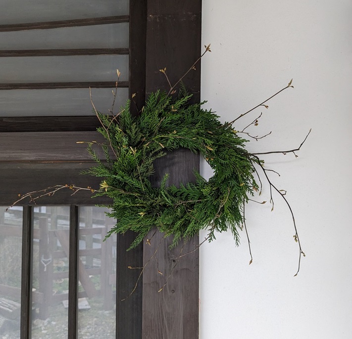 Madame TWood m’offre une couronne d’ailleurs, faite avec des feuilles de cyprès et une autre plante dont je n’ai su saisir le nom, elle explique: j’ai fait cette couronne en pensant à toi, Wakamé Tamago, et j’ai utilisé une plante qui a des épines.