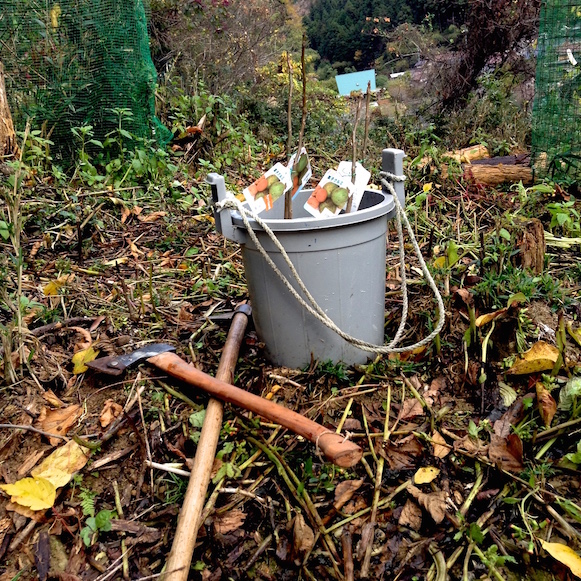 Je vais ramasser au bord des routes les feuilles mortes tombées. pour les déposer ensuite aux pieds des quelques arbres dans notre jardin. Mine de rien on a pas mal d’arbres sur une surface modeste, kaki, yuzu, amandier, noisetier, noyer, pommier, pécher, grenadier, figuier, olivier.