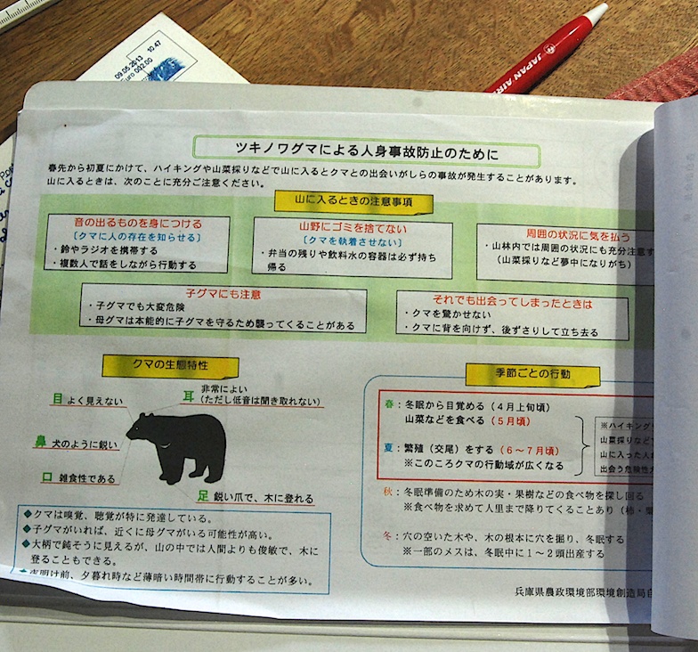 Dans le kairan, les messages que l’ont se passe de maison en maison dans le village, un pamphlet nous avertit du danger des ours, qui s’éveillent de leur période d’hibernation et risquent de s’haventurer sur les chemins de montagne à proximité du village, voire dans le village même.