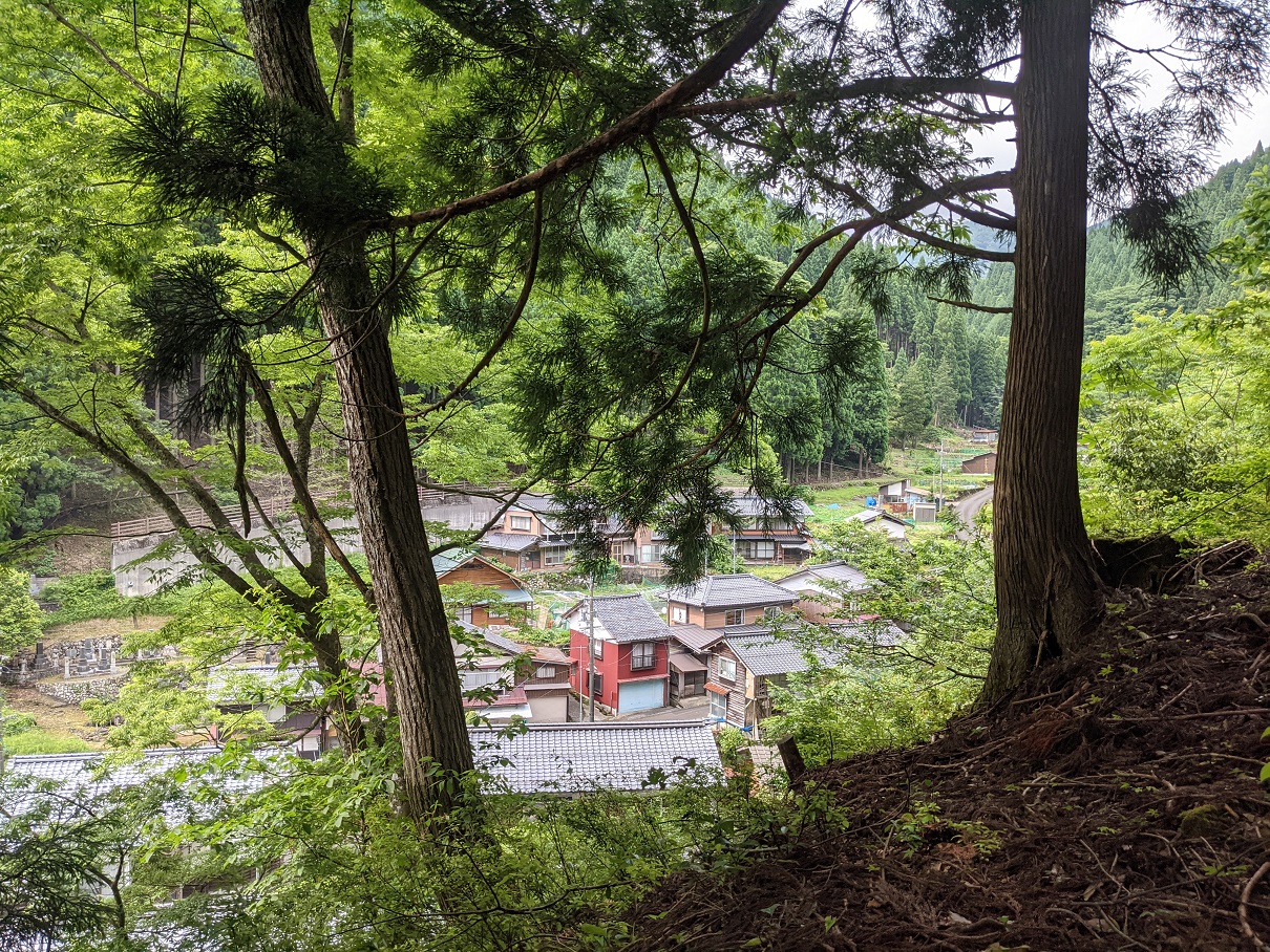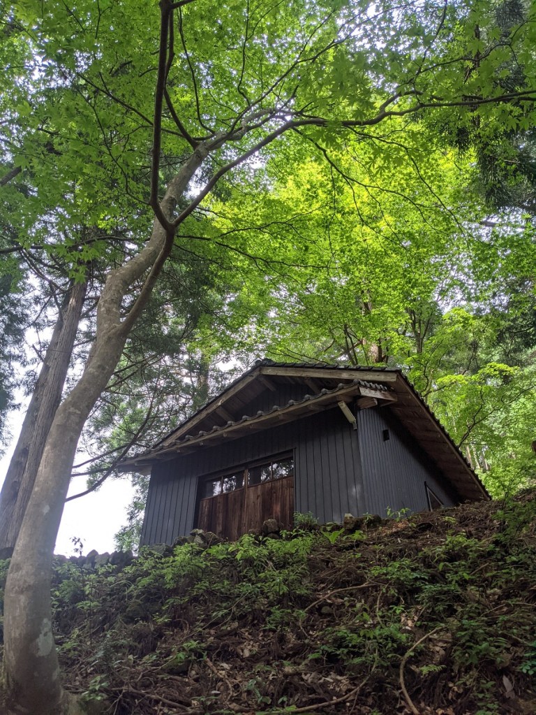 Un escalier en pierre grimpe assez sec et mêne au sanctuaire shintô qui protège le hameau. A l’époque Heiké ce devait être un bon endroit pour s’y planquer et faire le guet.