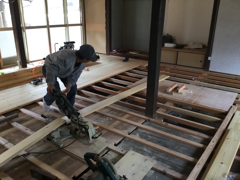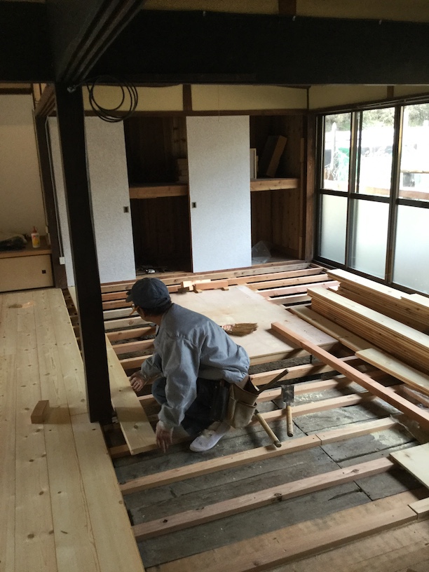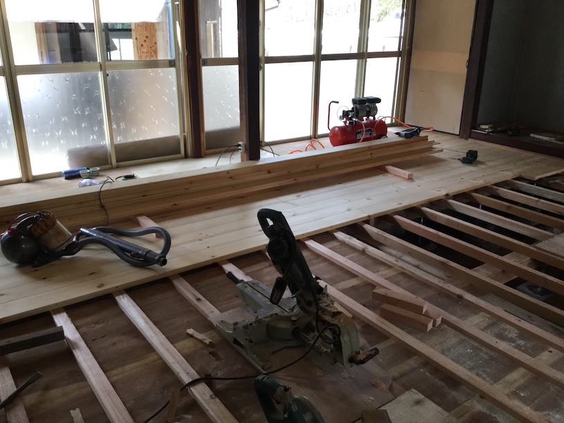 C’est parce que l’ancien plancher était ajusté pour des tatamis, qui font deux sun 寸(soit 6 cm) d’épaisseur. Or les planches de pin que nous allons poser font un sun d’épaisseur; il font donc élever l’ancien plancher d’un sun, d’un neuvième de sun pour être exact.