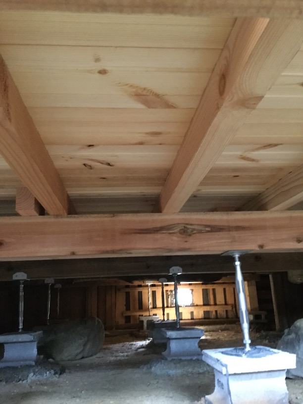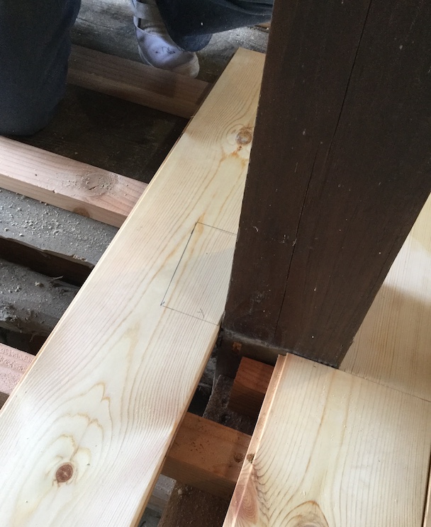Ici aussi, simple sur le papier mais il faut s’assurer que les planches de pin du parquet arriveront directement sous les montants des fenêtres et il y a des différences de quelques millimètres. A certains endroits on rehausse les chevrons d’un chouya, en posant dessous une petite pièce de bois.