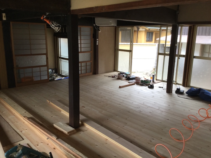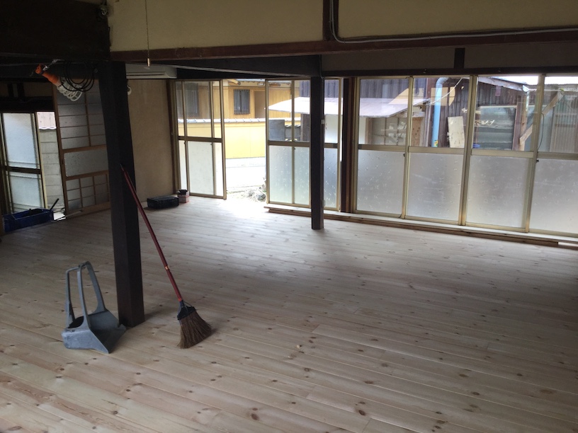 Les deux autres pièces, du côté de l’entrée, le plancher a été refait il y a quelques années par l’ancienne proprio donc pas besoin de tout refaire. La aussi on retire et jette les tatamis, car le nouveau parquet d’étendra sur les quatre pièces. On retire aussi les cloisons coulissantes. Cela fait un grand espace: