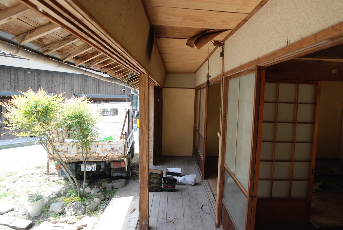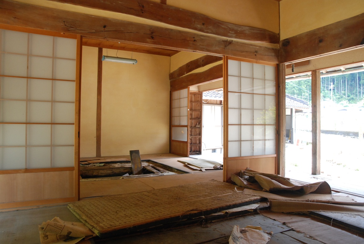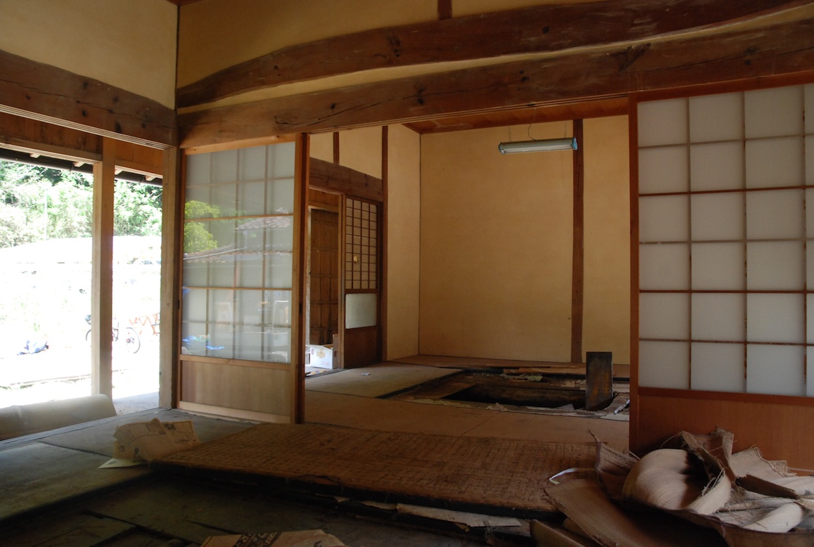 C’est une construction typique. On note que le plan original de la maison est tout comme les nôtres: 4 pièces à tatami sur la gauche, avec dans la pièce au fond orientée Sud, le tokonoma et l’emplacement de l’autel bouddhique. A droite un espace pour la cuisine et une pièce où l’on gardait une vache. Tout cet espace à droite était directement aménagé sur la terre battue, tandis que l’espace à gauche était élevé par rapport au sol, avec un plancher. Il y a 8 ans cette structure, ce plan de la maison traditionnelle japonaise ici dans la région je m’y attardais dans l’un des premiers articles de ce blog formidable. Article