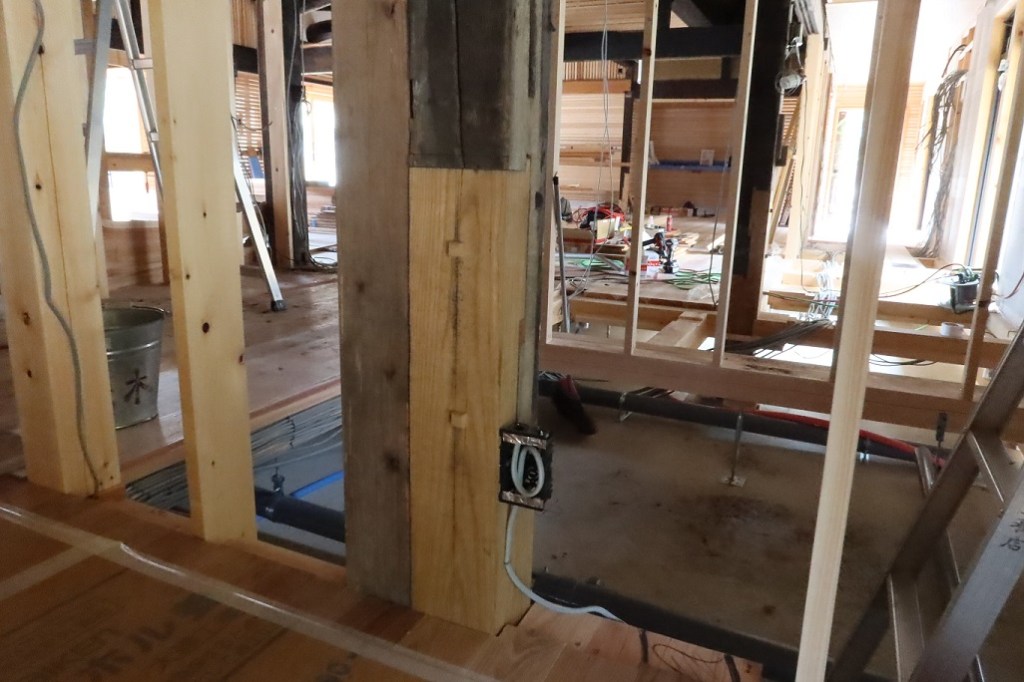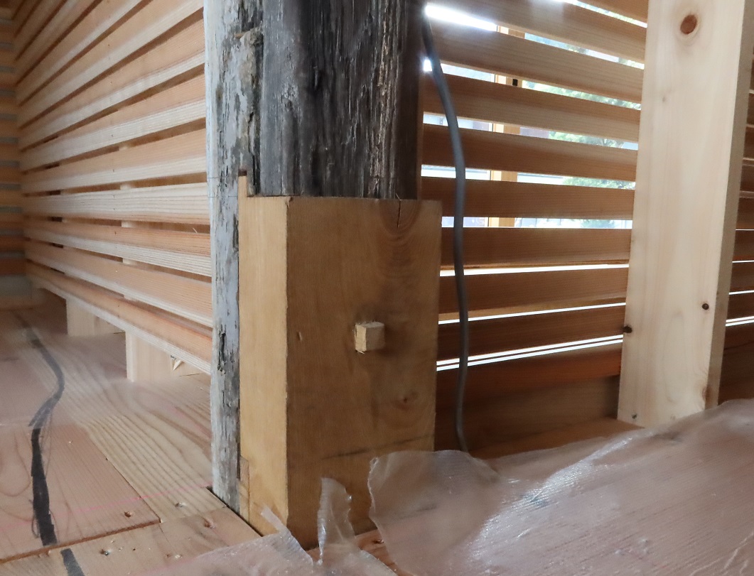 Mr T a soulevé la maison avec des crics, et a remplacé les partie basses des colonnes porteuses, endommagées par l’humidité, par de nouvelles pièces. On appelle cette technique netsugi 根継ぎ