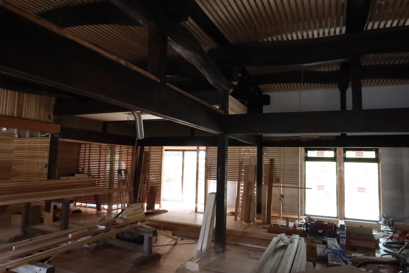 A noter aussi le mur en torchis d’origine sous la poutre. La partie neuve en latis sera ensuite recouverte de shikkui (enduit traditionnel)
