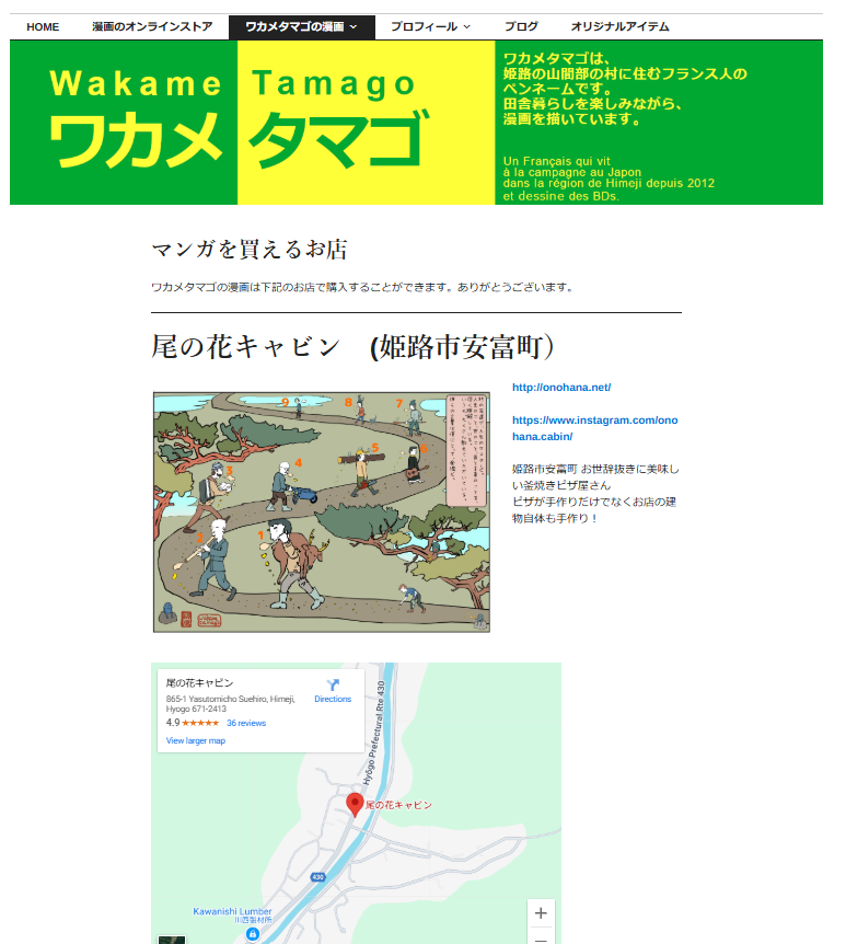 Sur la page japonaise du blog une page fait la liste des restaus et cafés de la région où l’on peut trouver mes bandes dessinées.