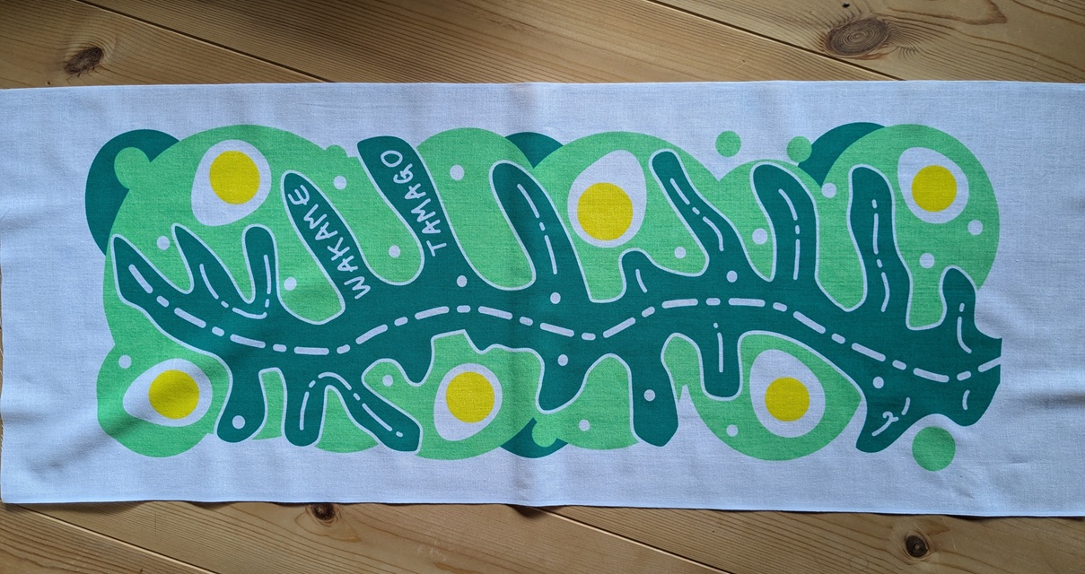 Le ténugui sur le thème des algues et des oeufs (ce qui correspond à mon pseudonyme wakamé tamago).