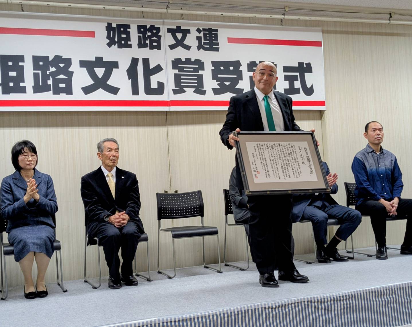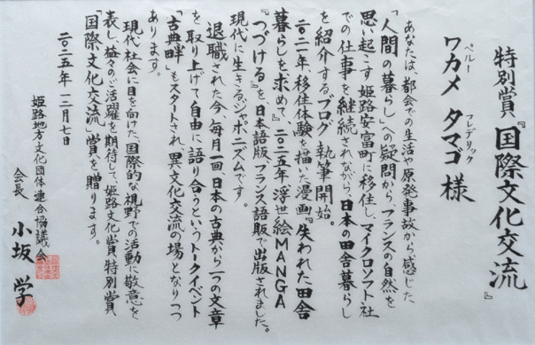 En hommage à vos activités, qui portent un regard international sur la société contemporaine, et dans l’attente de vos succès toujours croissants, nous vous décernons le Prix spécial de la Culture de Himeji – Prix d’échange culturel international.