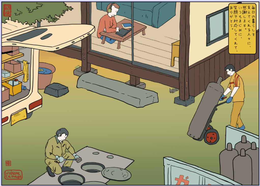 C’est pareil aussi pour le livreur de Takkyubin ou le postier qui sillonnent la région avec leur camions et nous livrent des trucs d’Amazon, commandés souvent la veille.