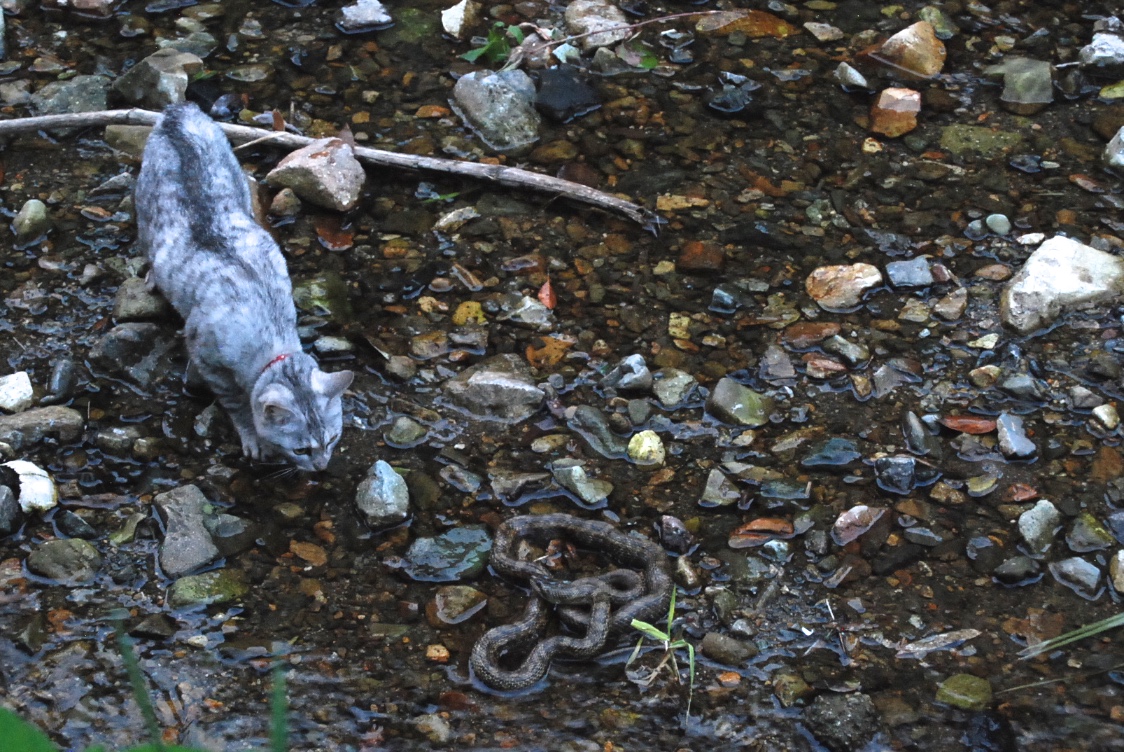 S’ensuit un fight. Minou le poursuit et donne de ces coups de pattes qui de loin ont l’air si mignon… c’est parce que on ne voit pas les griffes. Minou est sur le point de tuer le serpent je pense. Le serpent lui fait le mort.