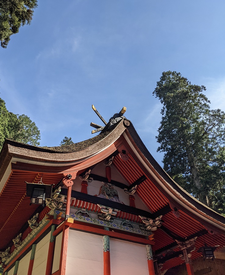 Le sanctuaire shintô, le jinja, ainsi placé au pied des arbres, nous rappelle directement au caractère sacré de la forêt. Il y a une interdépendance. Le jinja est sacré car il est dans la forêt. La forêt est sacrée car elle abrite un jinja. Dans le hondono du jinja la déité est symbolisée par un miroir; où la silhouette des arbres et le silence feutré de la forêt se reflètent.