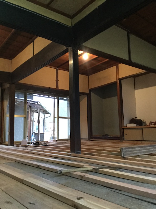 Ensuite on positionne des blocs de béton. Les poutres (oo-biki 大引き) du nouveau plancher s’appuieront dessus.