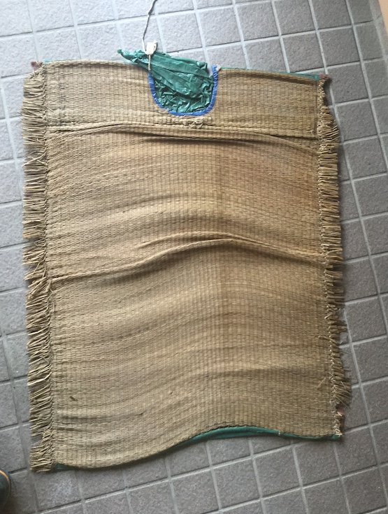 Une autre decouverte interessante, dans un placard, cet … impermeable … un version hybride des nattes de paille que l on portait autrefois pour se proteger de la pluie … on en voit sur les estampes anciennes, doublée d’une feuille de tissu synthetique … meme S. n’a jamais vu de truc pareil !
