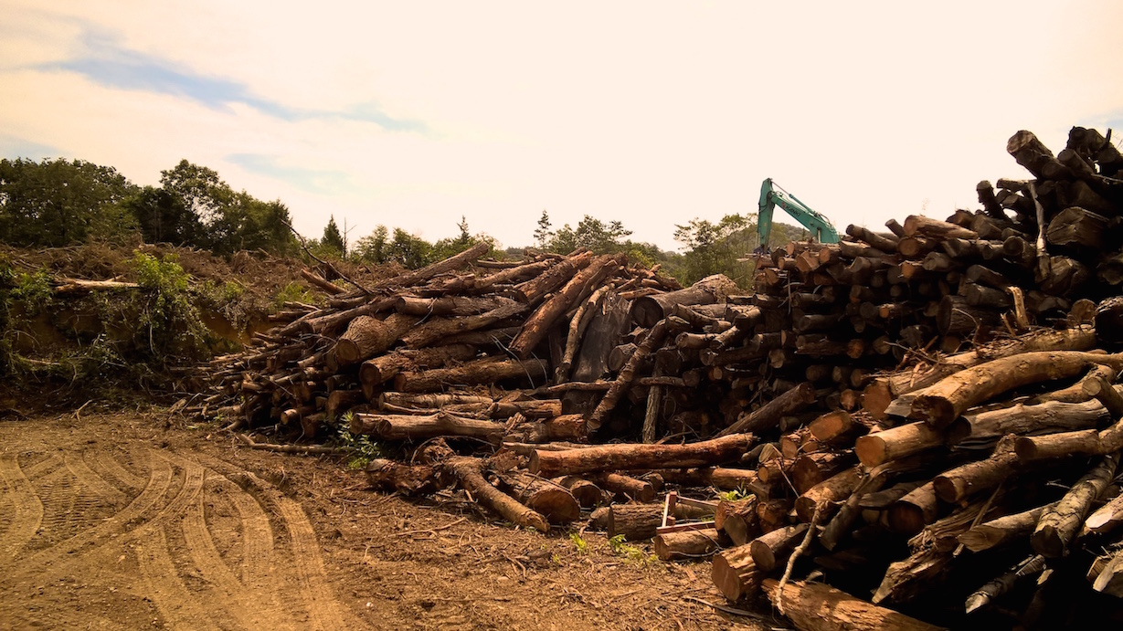 Pour ce faire une entière foret a été rasée. Et il est possible d’y aller chercher du bois.C’est un gros chantier avec des pelleteuses et plusieurs dizaines de personnes. Les branches des arbres ont été broyées, et il reste les troncs d’arbres, coupés et rangés en tas réguliers.