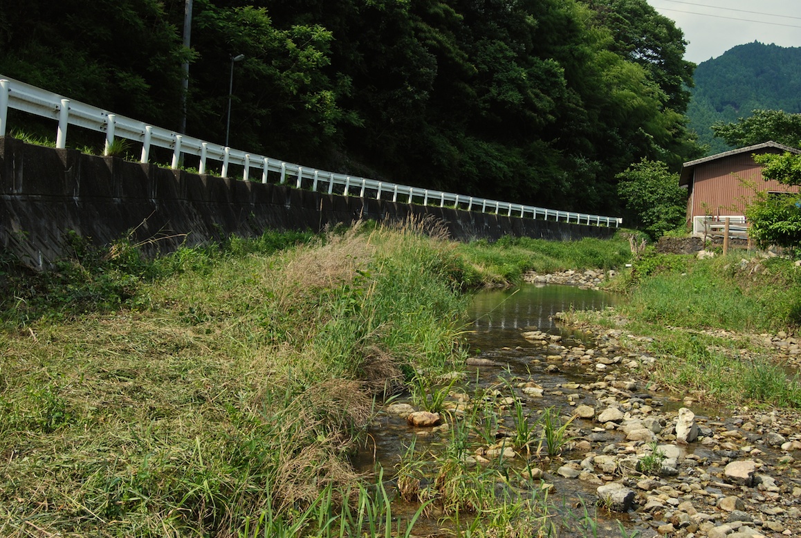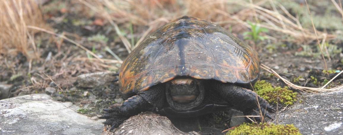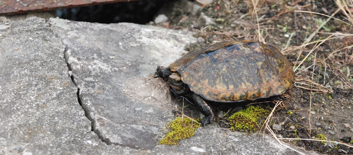Ce matin à cinq heures. Une belle tortue attend sur le bord de la route, en face du jardin. Certainement elle s’est hissée de la rivière. Il s’agit d’une nihon ishi game ニホニシガメ(Mauremys japonica).
