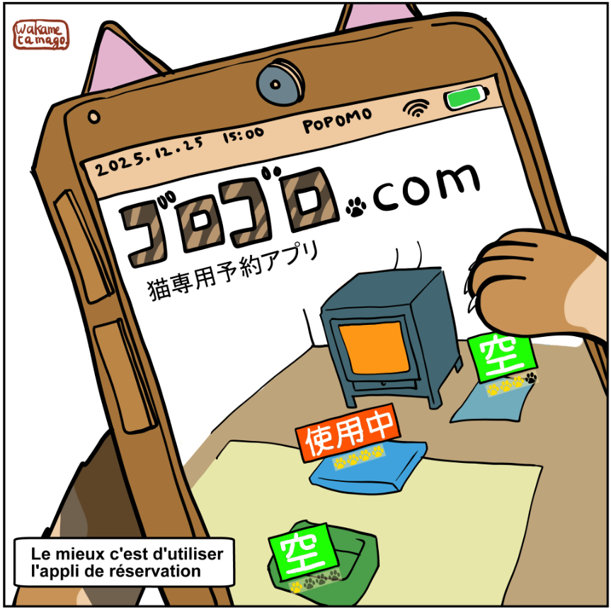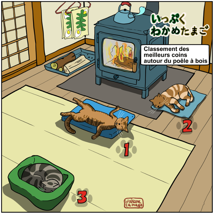 Noter les cônes de signalisation (la porte donne juste sur la route et je trouve que ça peut être dangereux) aux couleurs de Wakamé (vert) Tamago (jaune)