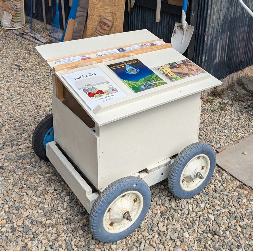 Je participerai à l’événement. Pour faire un petit stand -je n’aurai pas besoin d’une grande table; car j’ai seulement trois bande dessinées à mon compteur-, j’ai transformé l’engin à quatre roues de brouettes que j’avais fait il y a quelques année, pour transporter de grosses pierres.